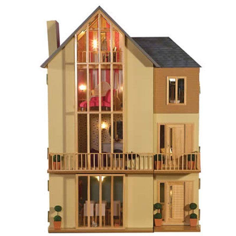 En kit y sin pintar. Casa de moderno diseño. Medidas: 71cm x 65cm x 41cm. Posibilidad de hacerla crecer un piso añadiéndole el Garden Room (ver en imagen abierta y cerrada)