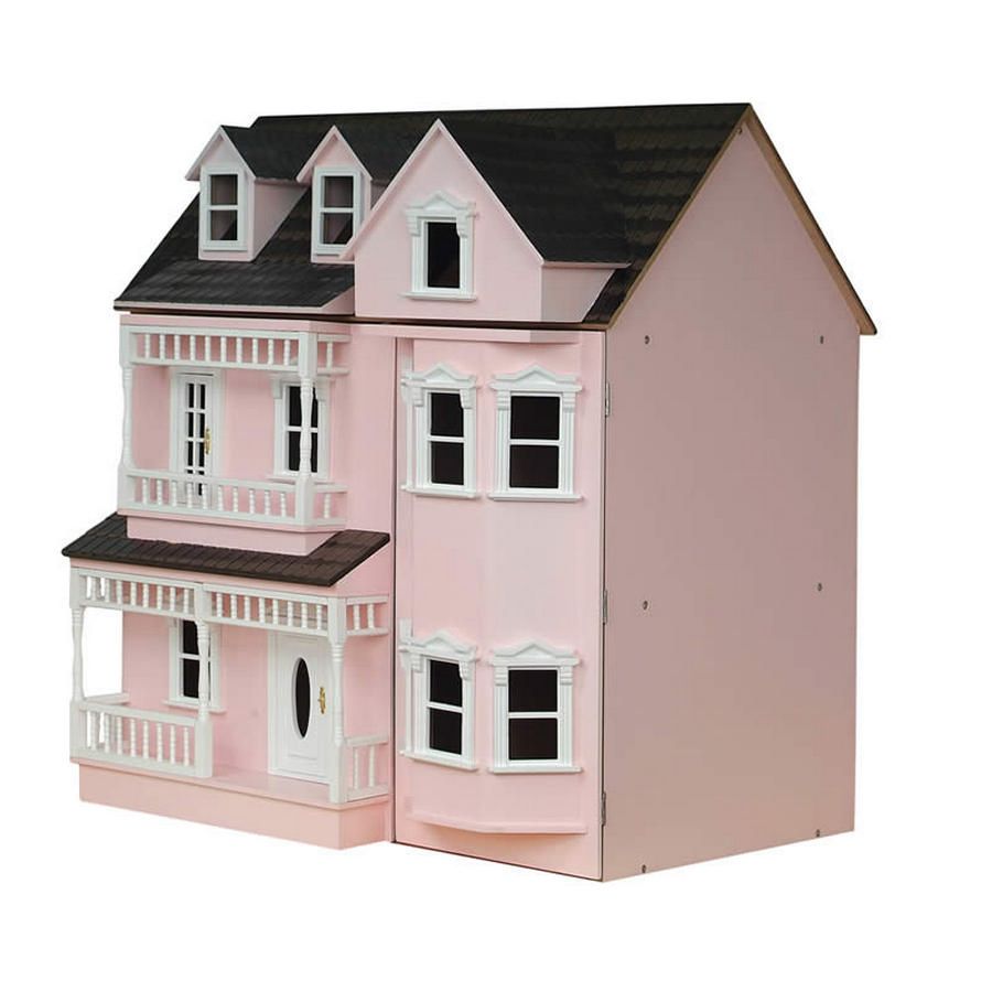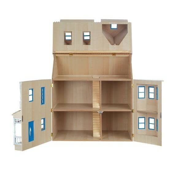 Casa de dos plantas con ático de techo abatible, apertura frontal dividida, porche y balcón. De estilo Victoriano. En KIT (sin montar)